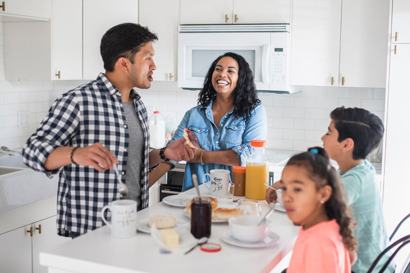 • A family in their kitchen eating breakfast